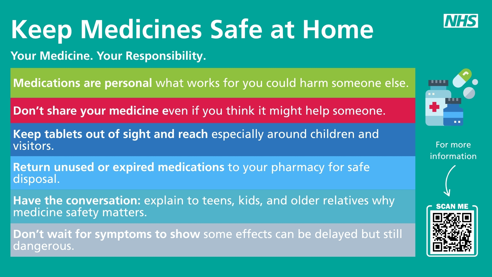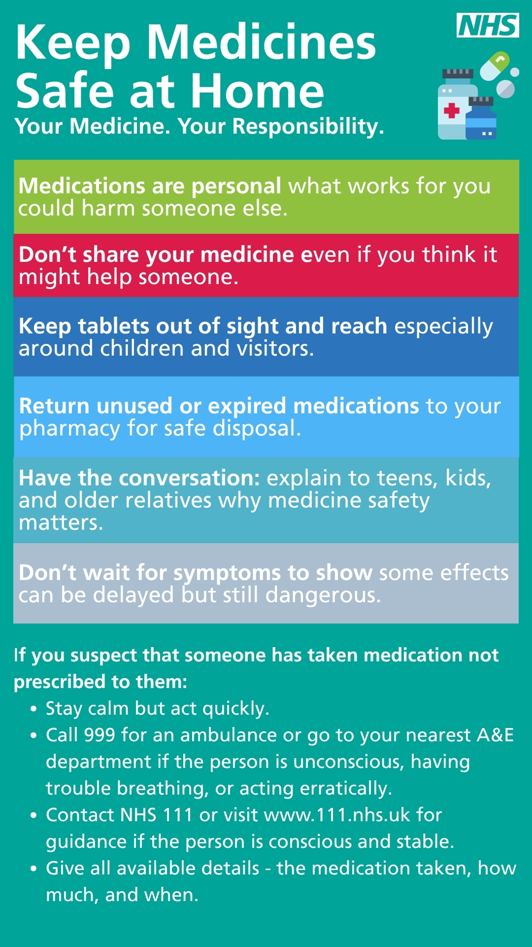 - Talk openly with your family — especially teens and elderly relatives — about the dangers of sharing or taking medication that isn’t theirs.